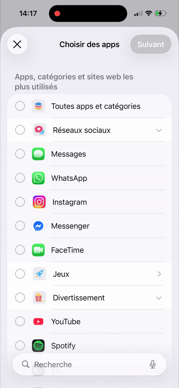 Sélectionnez les applications à bloquer temporairement (Instagram, TikTok...).